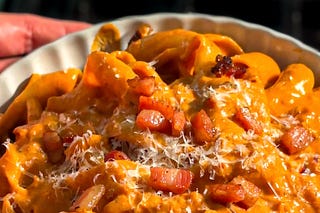 A rich, silky tomato cream sauce with a slow-rendered pancetta crunch and a bold chili kick. No vodka required.